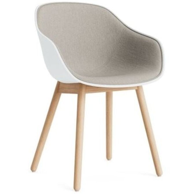 De About A Chair AAC 212 gestoffeerd van HAY, ontworpen door Hee Welling, combineert strak design met natuurlijk comfort. De ergonomisch gevormde shell is vervaardigd uit 100 % gerecycled polypropyleen en biedt een royale, lichte zitervaring met zachte armleuningen die uitnodigen tot ontspannen zitten.